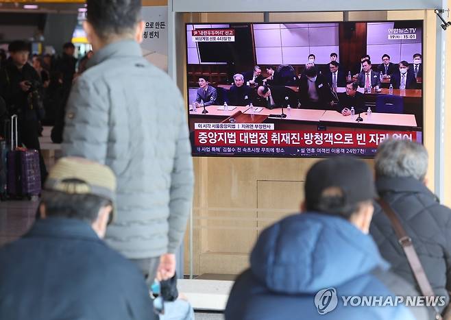 (서울=연합뉴스) 박동주 기자 = 12·3 비상계엄과 관련해 내란 우두머리 혐의로 기소된 윤석열 전 대통령에 대한 1심 선고가 열린 19일 서울역에서 시민들이 관련 뉴스를 보고 있다. 2026.2.19