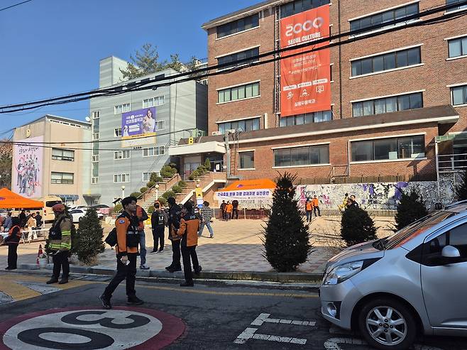 | ▲ 대학교 운동장에 설치한 훈련 본부 대학교 안에 훈련 본부를 설치해 놓고 훈련에 힘쓰는 소방대원의 모습 |