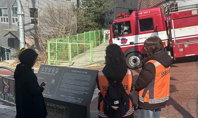 | ▲ 의용소방대원과 대화 의용소방대원과 대화 중에 '소방영웅길'에 대한 안내판을 보며 훈련의 의미를 새기는 필자 |