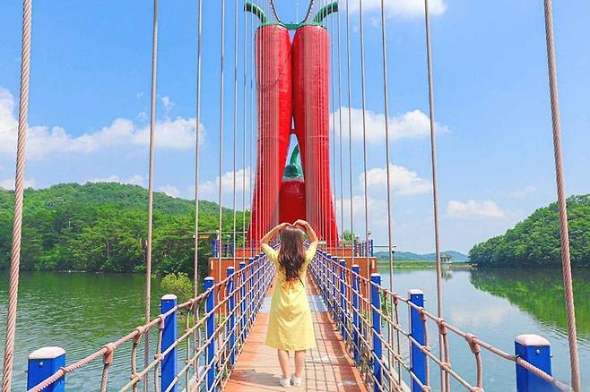 한때 우리나라에서 가장 긴 출렁다리(길이 207m)로 명성을 떨친 천장호 출렁다리는 이제 청양을 대표하는 랜드마크로 자리잡았다고 봐도 무방한데요. 16m 높이의 청양 고추 모형 주탑도 이곳에서만 볼 수 있는 독특한 풍경을 선사합니다.