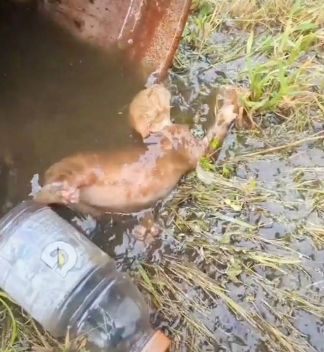설마 하는 마음으로 드럼통 안을 들여다보니, 그곳에는 작은 새끼 고양이 한 마리가 빠져있었다.