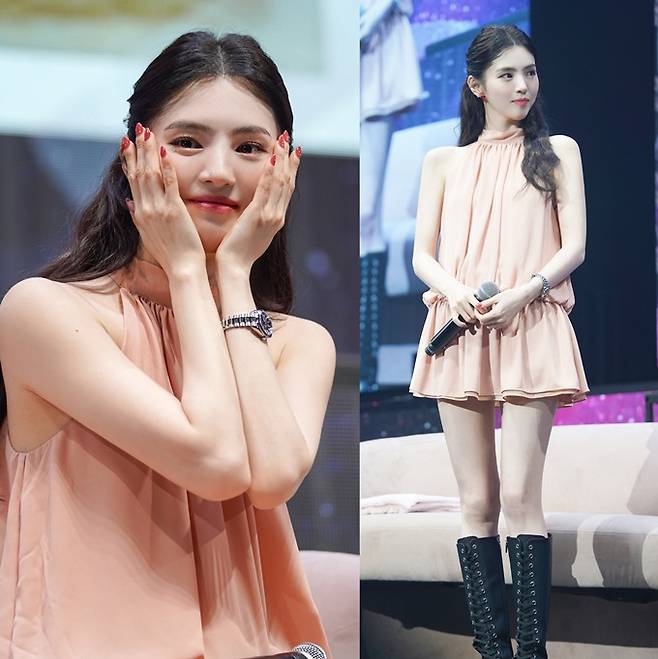 이날 한소희는 부드러운 핑크 톤의 홀터넥 미니 드레스에 고급스러운 오메가 타임피스를 매치한 팬미팅룩으로 특유의 러블리한 매력을 한껏 드러냈다.