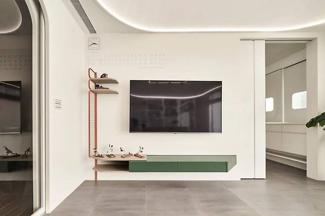아치형 벽면은 야구선수의 벤치를 떠올리게 하고, 초록색 러그와 붉은 소파는 야구장의 분위기를 절묘하게 재현했다. TV 옆의 홈런 기둥과 수납장은 공간의 중심을 이루며, 천장은 돔의 활기찬 응원 분위기를 계승한다. 가족의 소중한 추억과 일상이 담긴 공간이다.