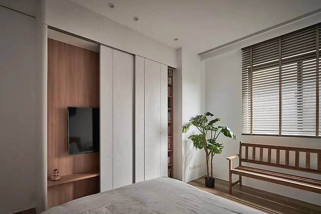 마지막으로 소개할 공간은 발리의 리조트를 떠올리게 하는 손님방이다. 열대 식물과 짙은 호두나무 색감이 조화를 이루고, 숨겨진 수납장과 가변형 벽 마감은 고급스러운 세컨드하우스 분위기를 전달한다.