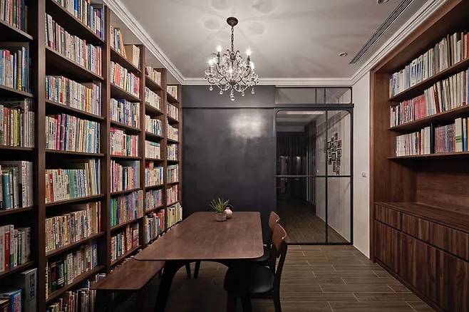 두 개의 대형 책장과 긴 테이블, 흔들리는 샹들리에 하나가 무게감 있는 분위기를 완성한다. 자리에 앉으면 현대와 고전, 아시아와 유럽이 교차하는 감각이 느껴진다.