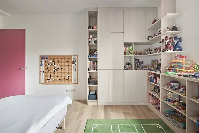 자매의 방은 밝은 네온 벽등으로 활기참을 표현하고, 동생의 방은 바둑에 대한 흥미를 중심으로 연출되었다. 수납장은 체계적으로 배치되어 생활과 학습을 모두 고려한 공간 구성을 이루고 있다.