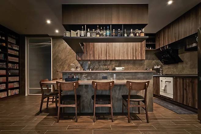 거실 옆 미닫이문을 열면 또 다른 세계가 펼쳐진다. 이곳은 일본식 ‘이자카야’를 꿈꾸는 식당 겸 주방이다. 빛바랜 노란 조명 아래, 짙은 우드톤의 가구와 바 테이블, 맞춤형 수납장이 드라마 속 장면처럼 분위기를 완성한다.