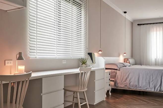 서재를 나와 향하는 곳은 미국 스타일로 꾸며진 안방이다. 벽면의 핑크빛 도장은 은은한 색감으로 공간에 부드러운 분위기를 더하고, 두 가지 스타일의 몰딩이 어우러져 클래식과 현대의 접점을 찾았다.