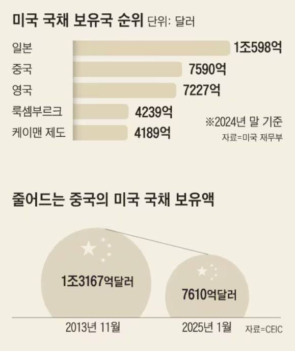 중국의 대미(對美) 지렛대인 미국 국채 매각도 쉽지 않다. 올 1월 현재 중국의 미국 국채 보유액은 1조 167억 달러(홍콩이 보유한 2577억 달러 합산)로 일본(1조 598억 달러)에 이어 세계 2위 규모다.