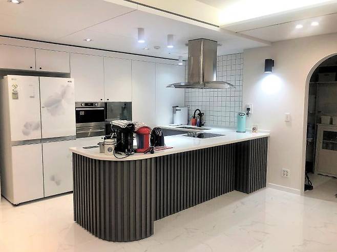 그러다 보니 이 부분을 철거하기보다는 포인트로 사용해야겠다 싶어 싱크대도 같은 디자인으로 연결한 거고 인테리어 필름 시공만 하여 색이 어우러지게 했어요.