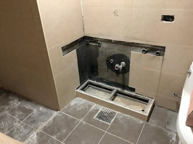 기존 화장실을 철거하고 보니 바닥에 앵글이 설치되어 있어 저 부분을 철거하면 공사가 커지니 그냥 덮기로 했어요.