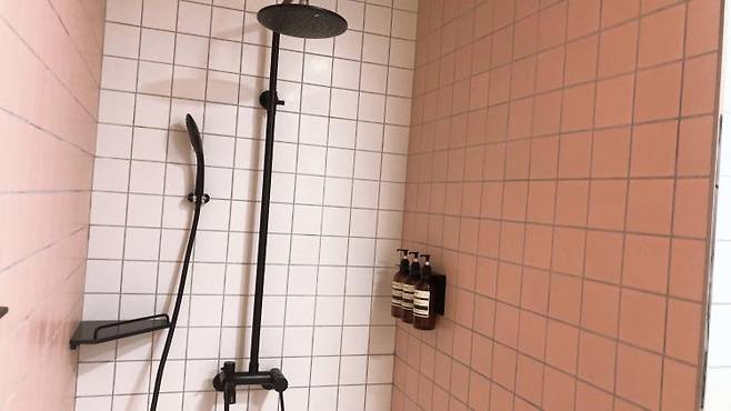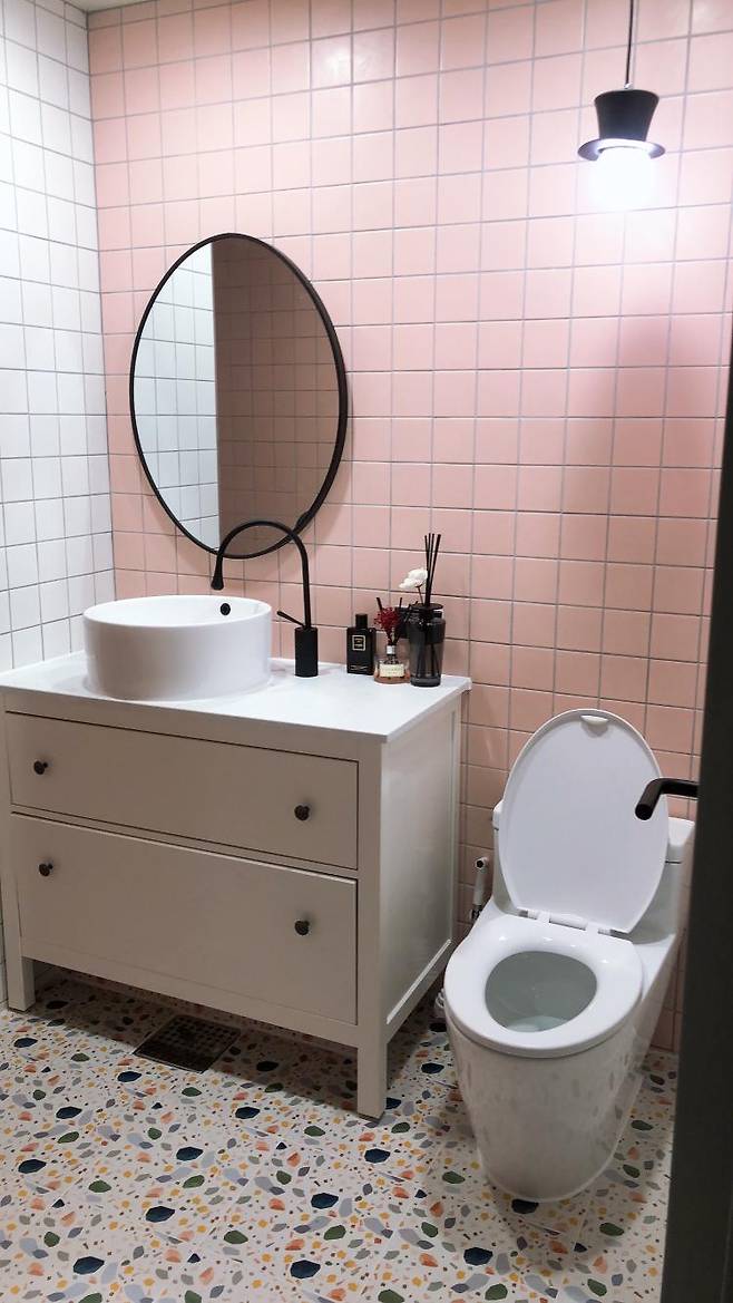 바닥에 테라죠 타일을 깔았더니 미끄럽지 않고 머리카락도 잘 보이지 않아 좋아요.
