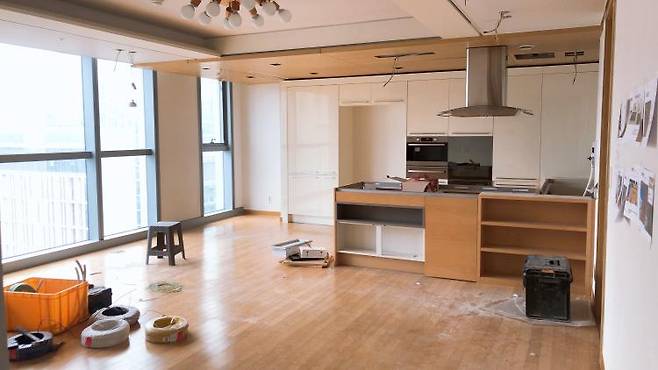 저희 집은 대면형 주방 구조를 가졌어요. 아무래도 거실과 주방이 같이 있어 가구 배치에 어려움이 많아 다소 인기가 없던 집이었어요.