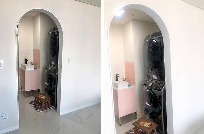 바로 세탁실이 옆에 있었는데 문을 떼고 쓰면 편하겠다 싶었고 냥이 화장실도 두고 사용하면 좋겠다 싶어 아치형 문틀을 제작하여 마감했어요.