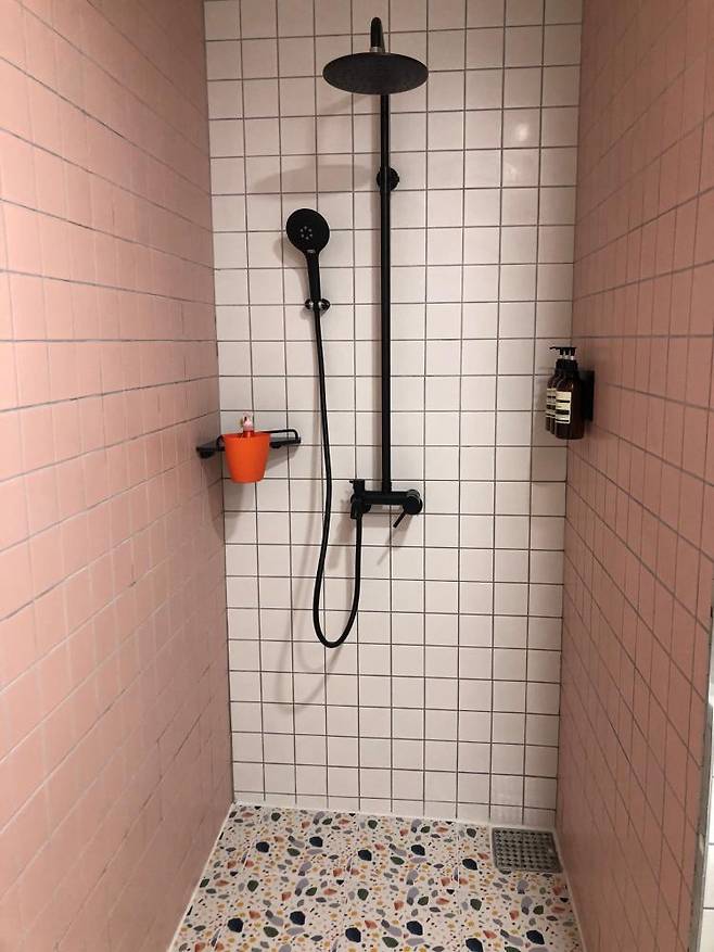 바닥에 테라죠 타일을 깔았더니 미끄럽지 않고 머리카락도 잘 보이지 않아 좋아요.