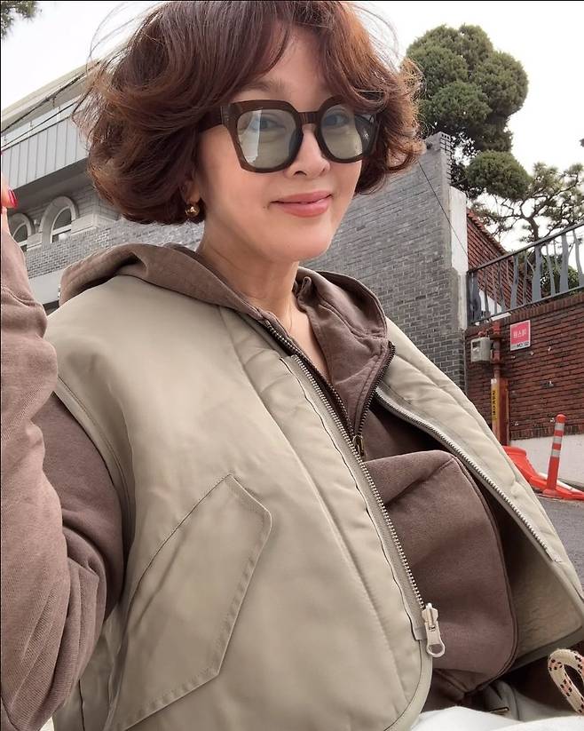 이승연은 화이트 팬츠에 브라운 후드 집업, 그리고 세련된 카키 컬러의 크롭 패딩 조끼를 매치해 편안함과 고급스러움을 동시에 담아낸 캐주얼 룩을 완성했습니다.