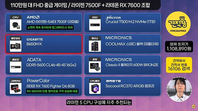 110만 원대 추천 견적서 (FHD 중급 게이밍)