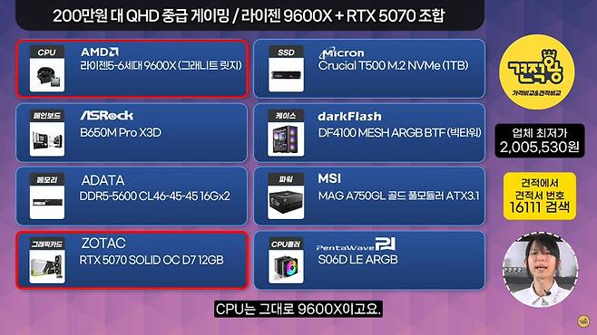 CPU는 5070 견적처럼 그대로 9600X이고, 그래픽카드를 제외한 나머지 부품 구성도