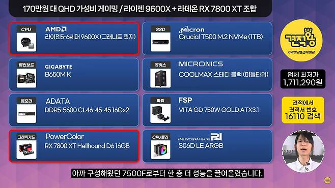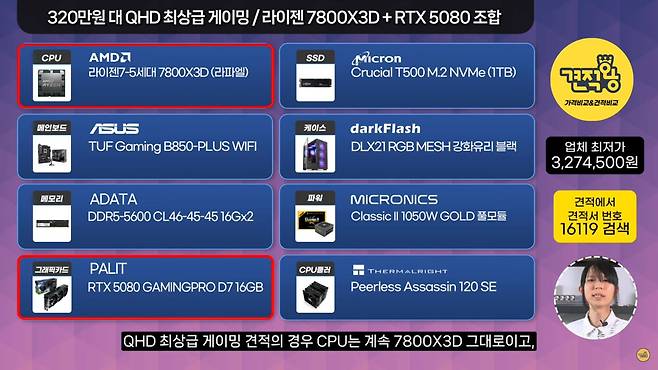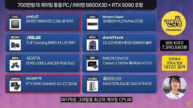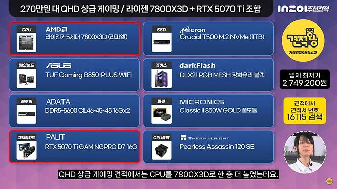 QHD 최상급 게이밍 견적의 경우 CPU는 계속 7800X3D 그대로이고,