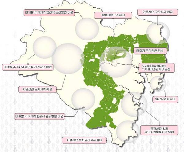 이와 함께 도로나 하천건설로 발생한 자투리땅 개발제한구역 21만㎡도 해제된다. 개발총량에 포함되지 않은 지역으로 해제면적 규모는 축구장 30개 크기에 달한다. 그린벨트에 묶인 땅이 풀리면서 개인의 재산권 행사가 유리해질 전망이다.