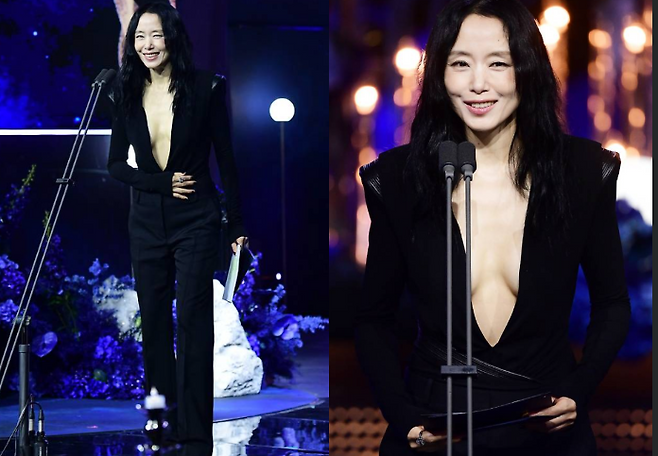 전도연은 이번 4회 청룡 시리즈 어워즈에서도 역시 기대를 저버리지 않았습니다. 수많은 셀럽들 속에서도 단연 돋보였던 그녀의 룩은 바로 베르사체의 25FW 컬렉션 점프수트.