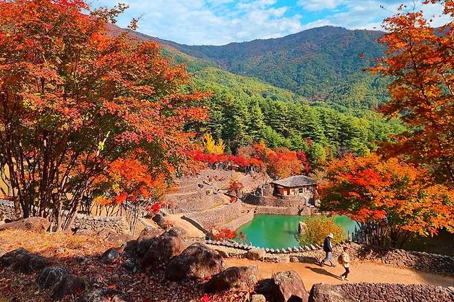 가을철 단풍이 물든 산과 함께 어우러져 신비로운 분위기를 더하며, 마치 다른 세계에 온 듯한 기분을 줍니다.