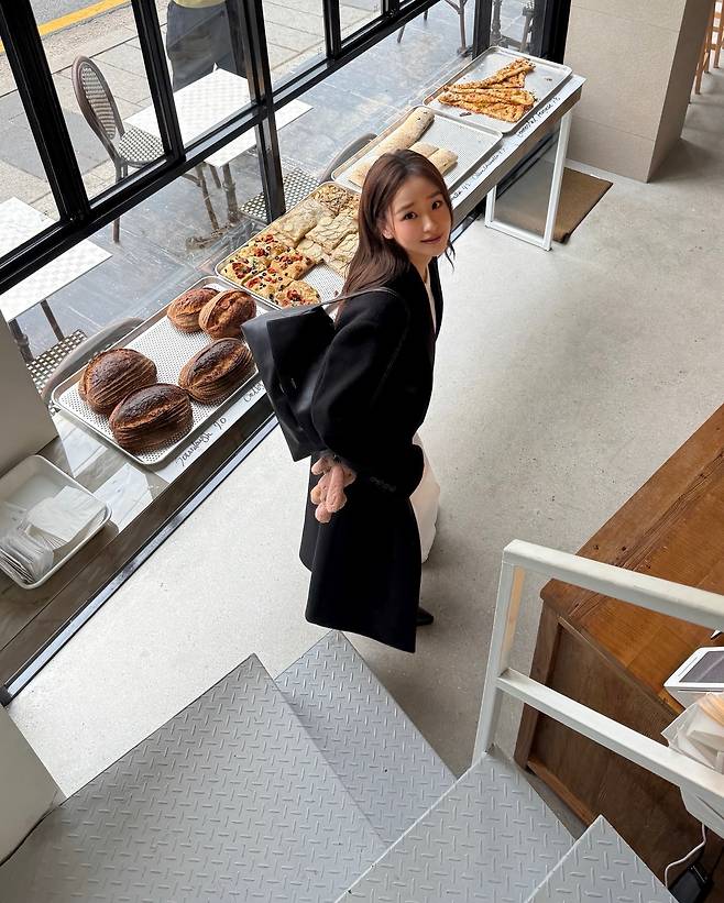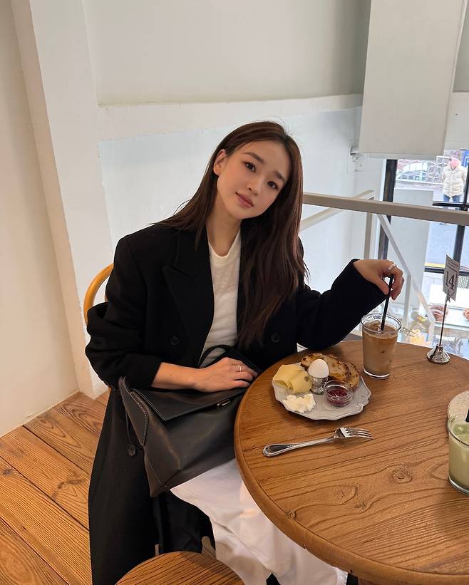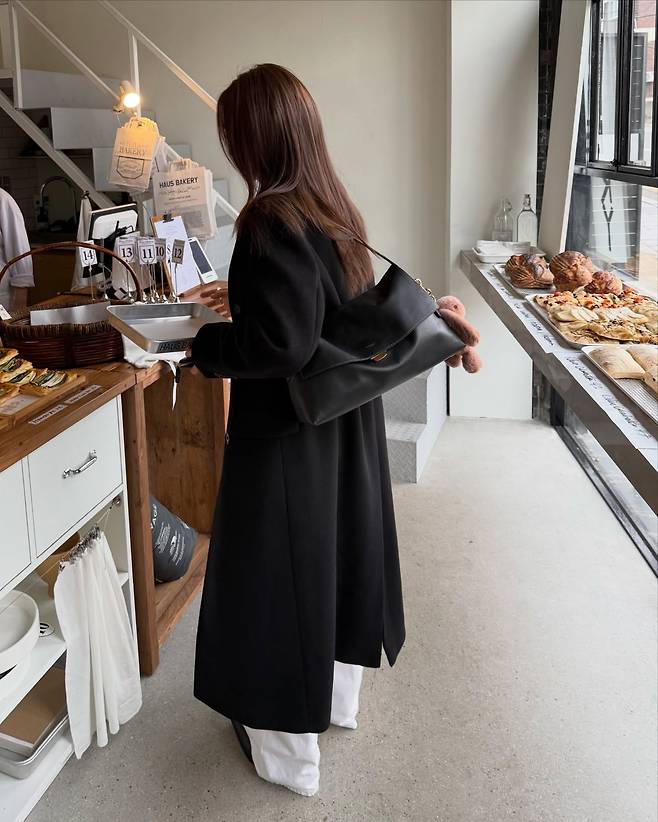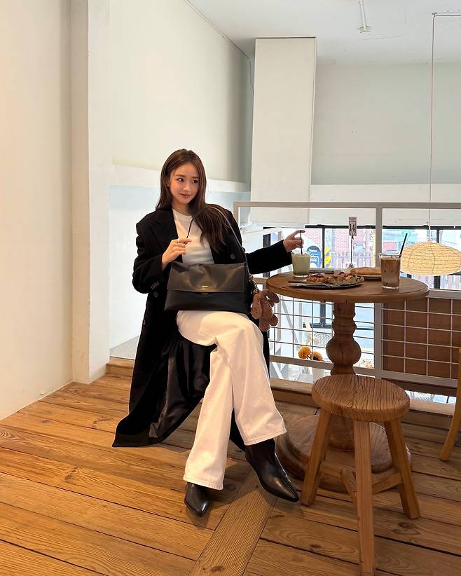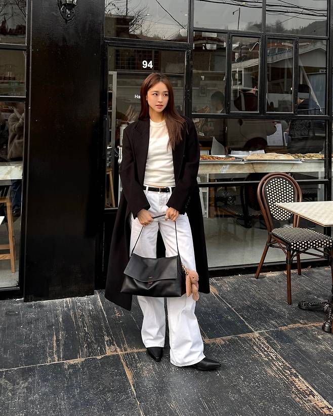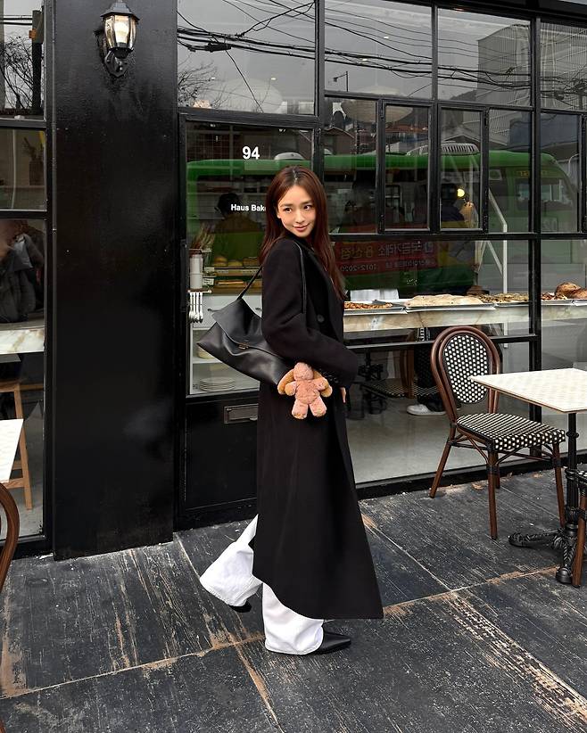 여기에 어깨에 툭 걸친 짙은 검은색 롱코트는 전체적인 밝은 톤에 안정감을 더하며 분위기를 한층 고급스럽게 만들어주네요.