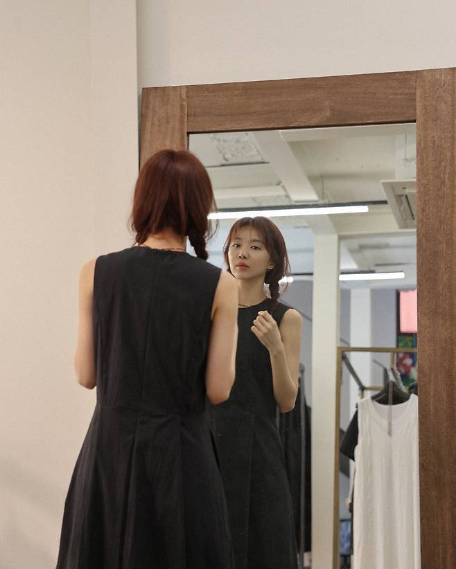 여기에 귀여운 땋은 머리 스타일과 블랙 메리제인 슈즈를 매치해 청순하면서도 사랑스러운 무드를 완성했어요.