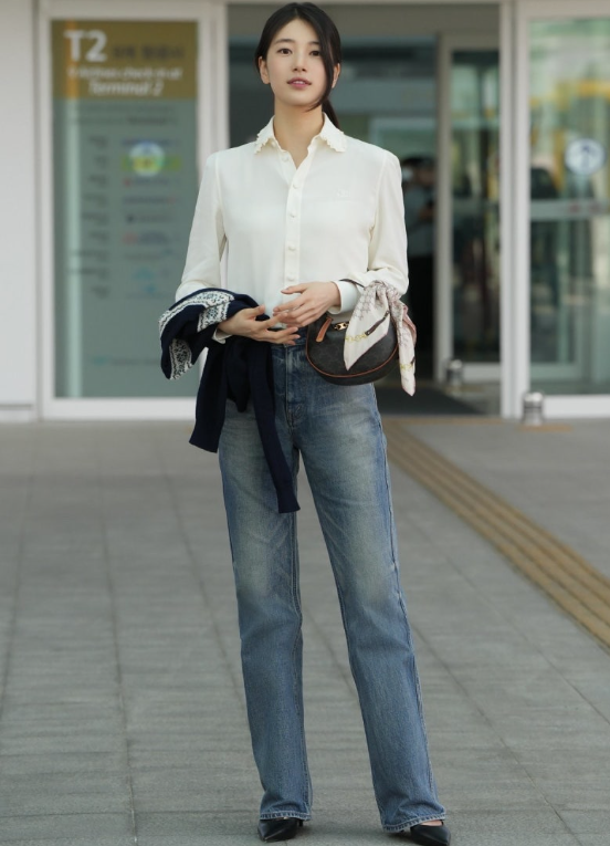 수지는 무광 브라운 톤의 호보백으로 내추럴한 분위기를 살렸습니다. 린넨 셔츠와 팬츠에 부드럽게 어우러지는 디자인으로, 데일리룩에도 자연스럽게 녹아들죠. 과하지 않은 미니 사이즈와 실용적인 구조는 수납력까지 만족!