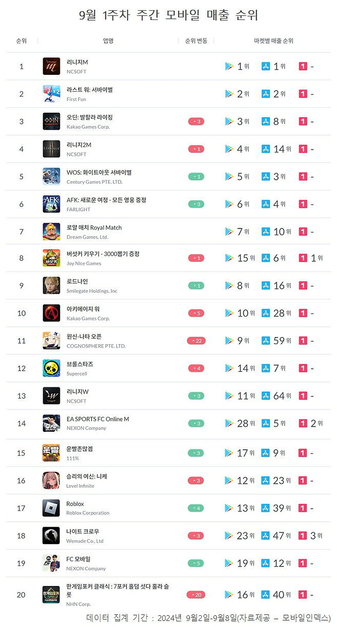 한 주간의 매출 순위를 알아보고 국내 모바일 게임 시장에 어떤 변화가 있었는지 확인하는 '주간모바일순위' 코너입니다. 구글 플레이와 애플 앱스토어, 원스토어 등 국내 3대 마켓에서의 모바일 게임 매출을 합산해 산출한 순위를 통해 매주 모바일 게임 시장 변화를 독자들에게 제공하고자 합니다. <편집자주>