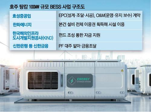 효성중공업이 설계·조달·시공(EPC)과 운영·유지 보수를 맡고, 한화에너지가 해당 시설 전체를 이용할 수 있는 권한을 확보해 호주 현지 전력 사업에 활용한다. 금융 측면에선 국토교통부가 조성한 글로벌 플랜트·건설·스마트시티(PIS) 펀드와 KIND가 참여해 국내 기업의 해외 인프라스트럭처 시장 진출을 지원하는데, 해당 PF 대주를 신한은행과 신한자산운용 등 신한금융이 맡은 것이다.