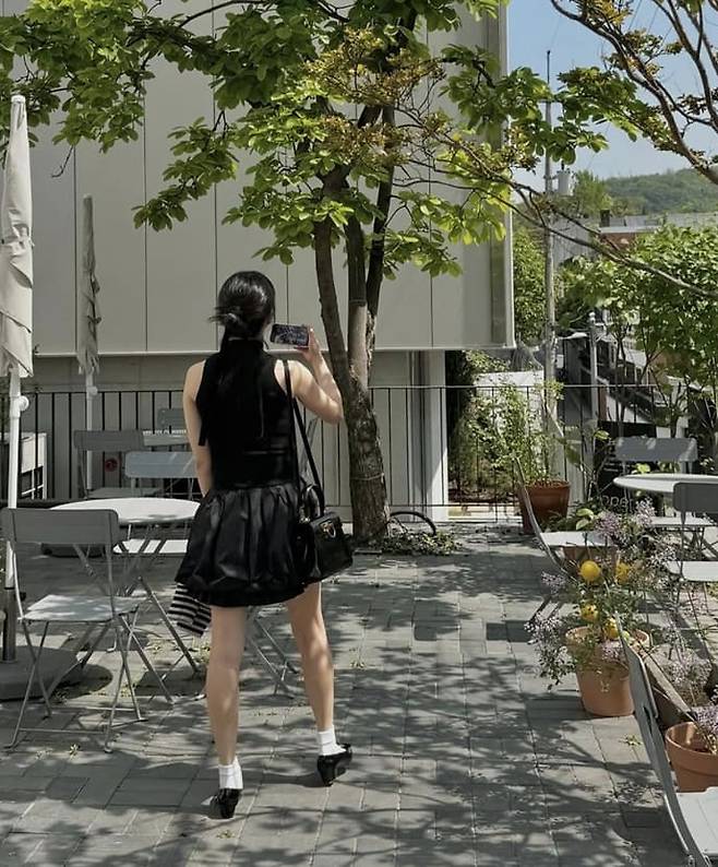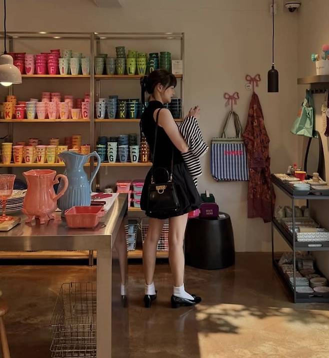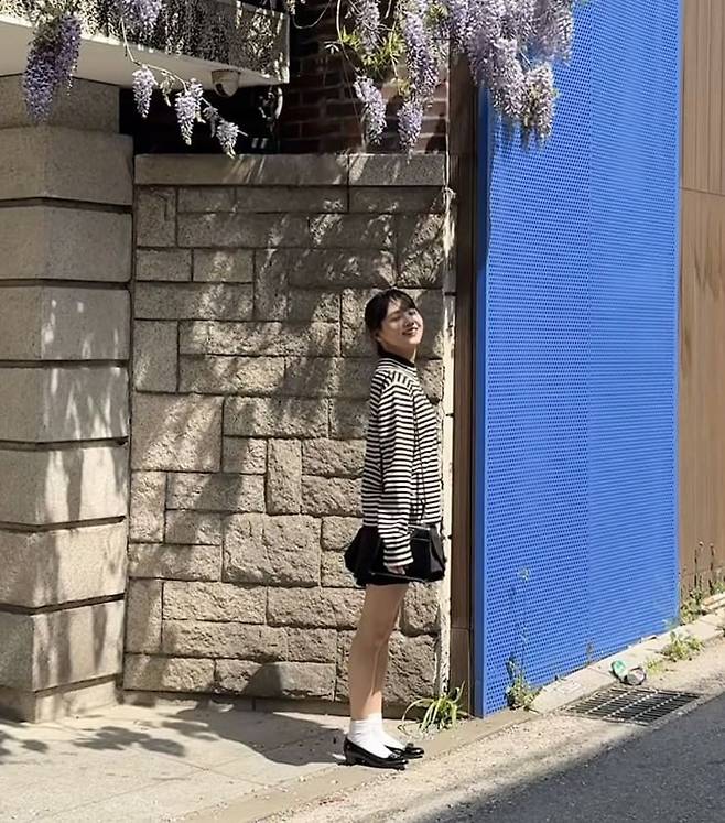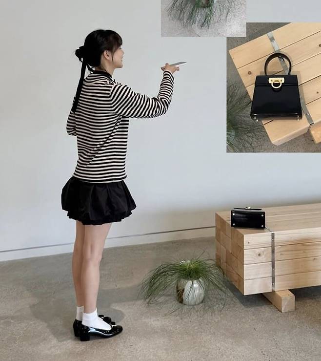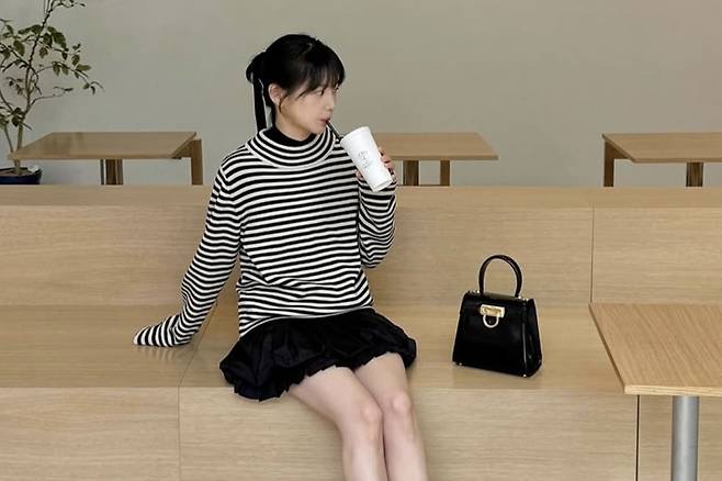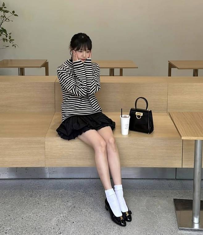 윤승아는 블랙 앤 화이트 스트라이프 티셔츠와 블랙 미니스커트로 심플하면서도 사랑스러운 분위기를 연출했어요. 특히 루즈한 핏의 티셔츠와 미니멀한 스커트가 어우러져 여리여리하면서도 깔끔한 스타일이 완성됐죠. 여기에 하얀 양말과 블랙 로퍼를 더해 클래식하면서도 세련된 감성룩을 보여줬는데요.