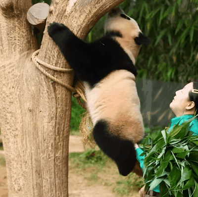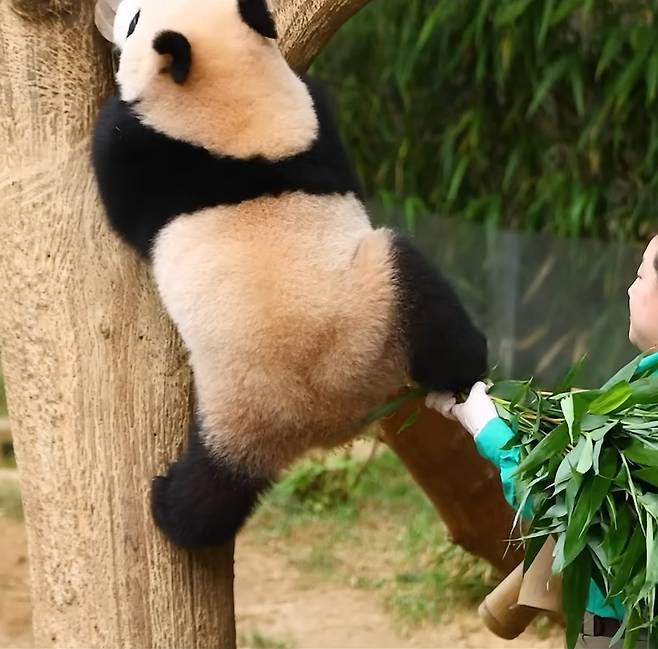 루이바오는 '이모! 루야 잘 잡아줘!', '이모는 날 절대 놓치지 않을 거야! 내 뒤에는 언제나 이모가 있어!' 라는 듯, 자신을 든든하게 받쳐주는 이모를 믿고 꿋꿋하게 나무를 오릅니다.