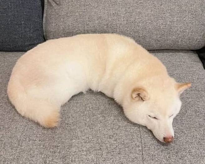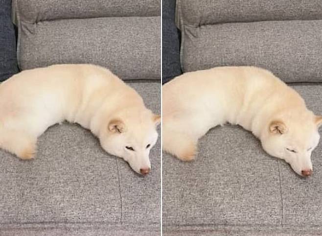 공개된 사진 속에는 밀려오는 졸음에 주체하지 못한 시바견 강아지가 소파 위에 올라가서 몸을 웅크리고 누워 있는 모습이 담겨 있었죠.