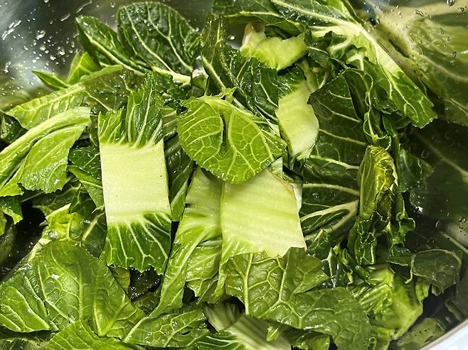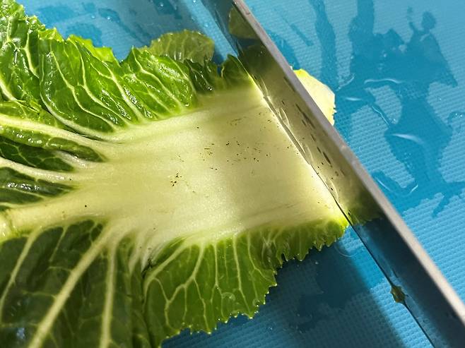 봄동은 잎이 큰 편이기 때문에 한 입 크기로 적당히 칼로 자르세요.