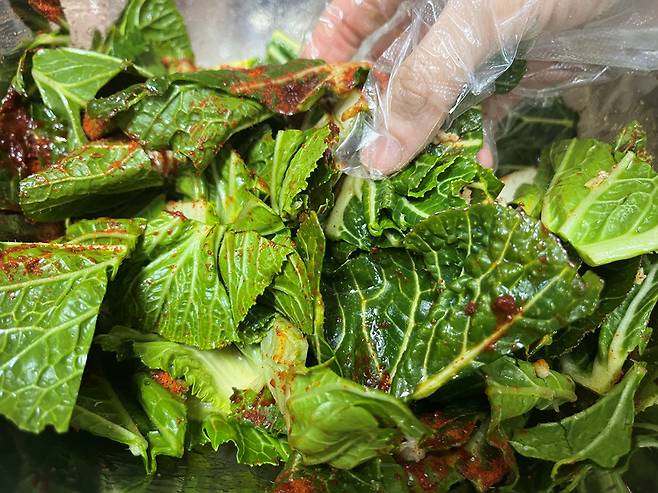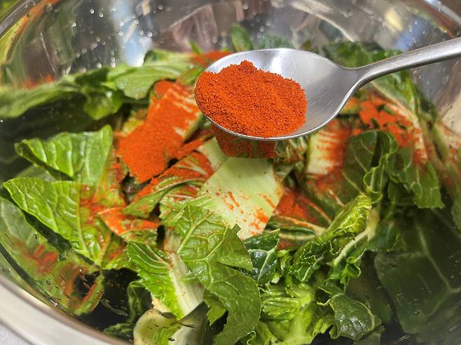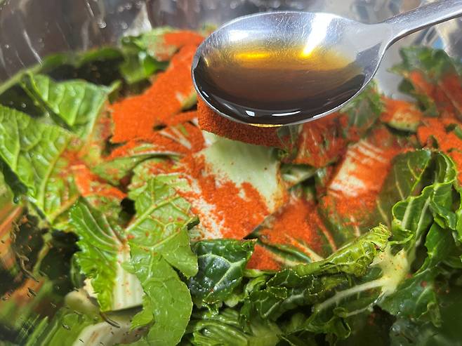 이제 양념이 봄동에 골고루 섞일 수 있도록 손으로 잘 무쳐 줍니다. 특히 고춧가루가 덩어리 진 곳이 없도록 잘 봐가며 무치세요.
