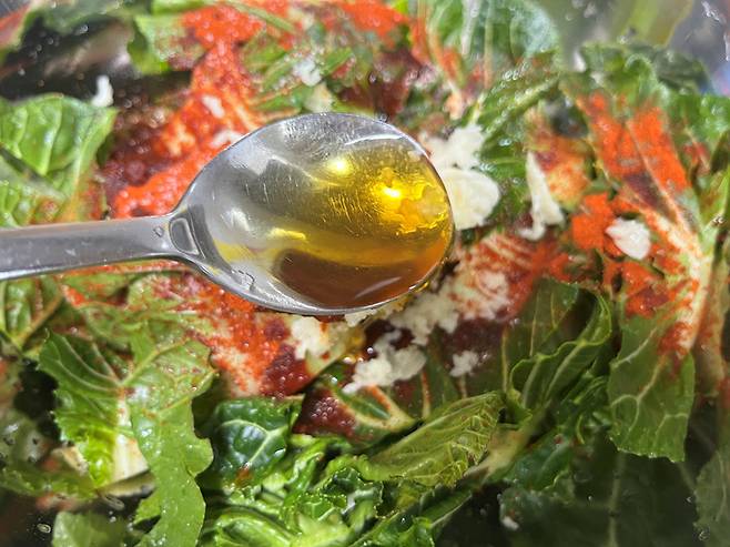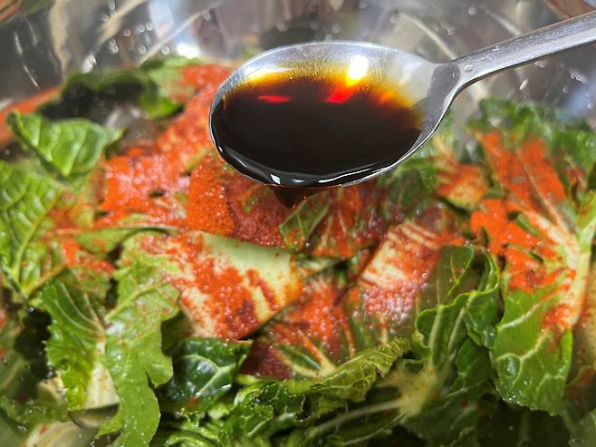 까나리 액젓도 1스푼 넣습니다. 액젓은 향이 강하지만 겉절이 만들 때 넣으면 다른 재료와 잘 어우러져 향이 부담스럽지 않습니다.