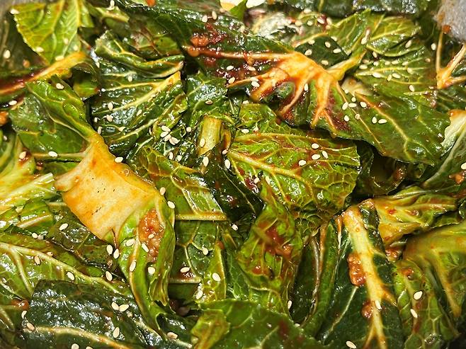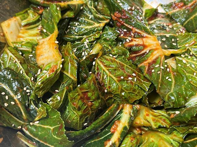 통깨까지 뿌리면 먹음직스러운 봄동 겉절이가 완성됩니다. 배추로 만든 겉절이보다 훨씬 쉽고 맛있습니다.