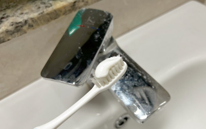 세면대와 수전에 치약을 발라 문질러보세요