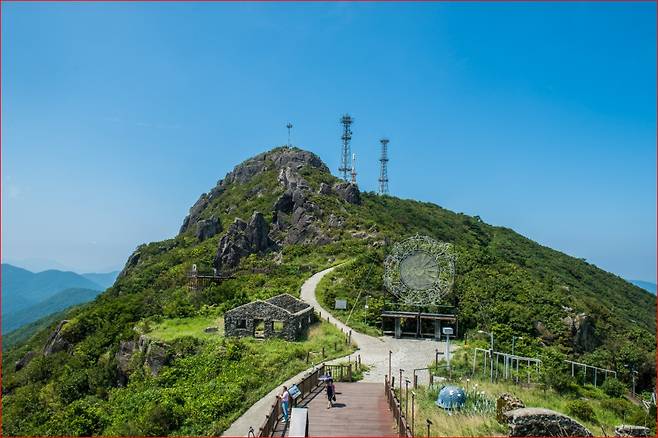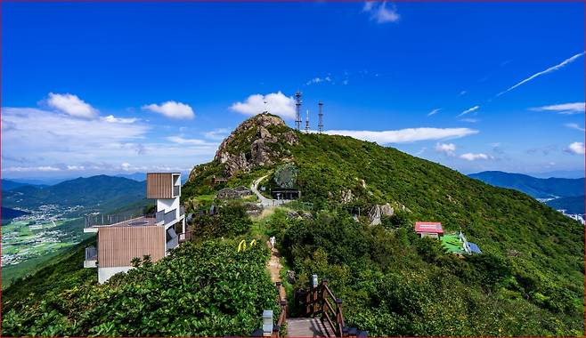 정상에 도착하면 예전 미군 통신대 터가 있던 공간에 마련된 전망대 포토존이 반겨줍니다. 바다와 산, 도시 풍경이 겹쳐지는 이곳은 여름철에도 산들바람이 불어와 잠시나마 더위를 식히기 좋습니다.