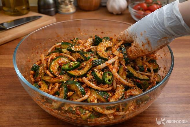 준비한 양념장에 물기를 뺀 오이를 먼저 넣고 버무린다. 오이 겉면에 양념이 고르게 입혀지면 양파와 고추를 넣어 섞는다. 부추는 세게 뒤섞으면 숨이 금방 죽으므로 가장 마지막 단계에서 가볍게 버무린다.