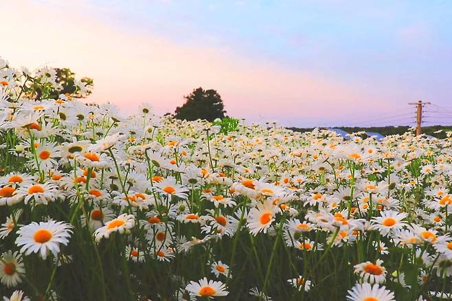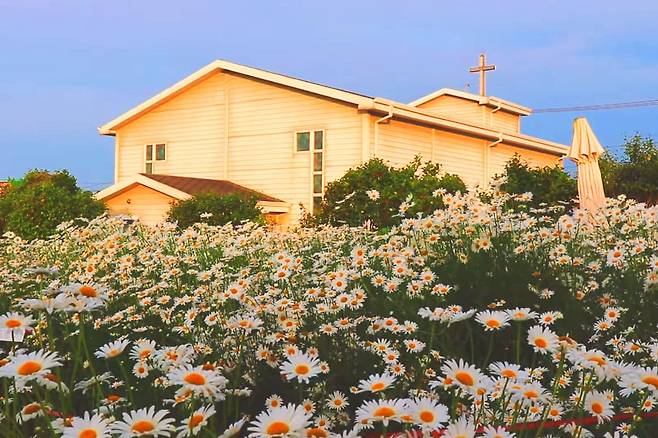 선흘리의 오래된 교회, 선흘교회다. 이곳은 제주의 자연과 어우러진 데이지꽃 명소로, 인공적인 조경 없이도 아름다움을 자아낸다.