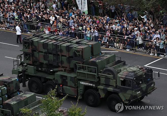 (서울=연합뉴스) 김도훈 기자 = 건군 제76주년 국군의 날 시가행진이 열린 1일 한국형 3축 체계(킬 체인·한국형 미사일 방어·대량응징보복) 자산 중 하나인 패트리어트 미사일(PAC-II)이 서울 중구 세종대로 위를 지나고 있다.