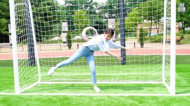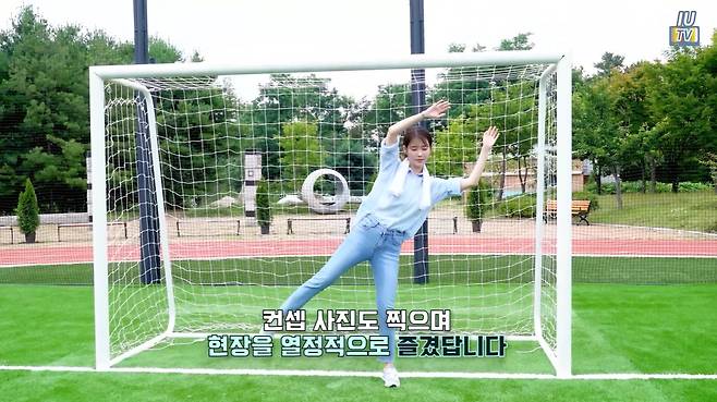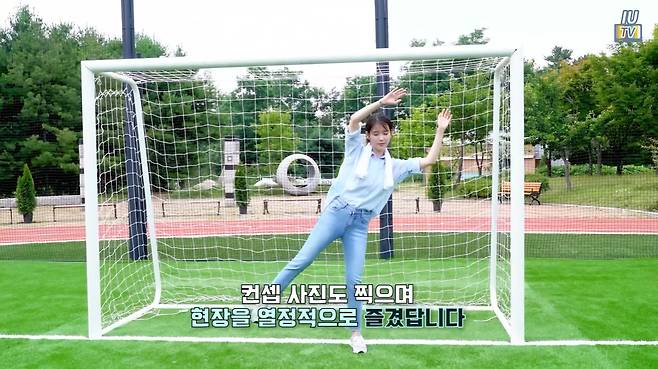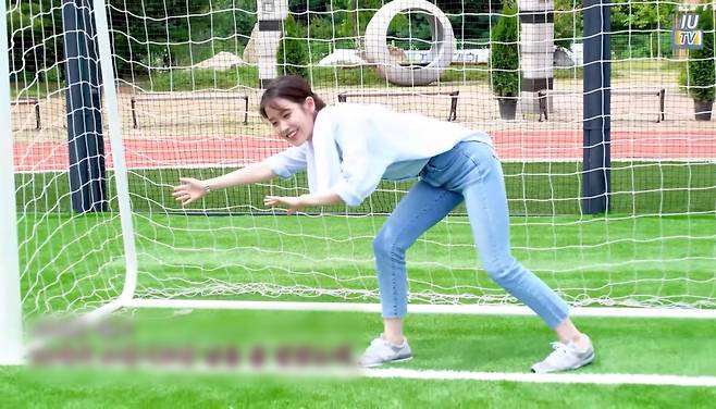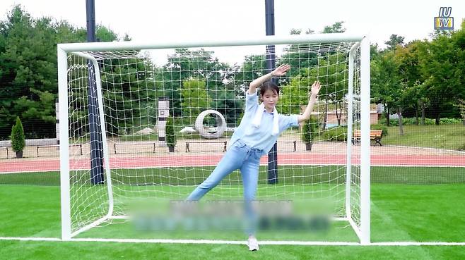 아이유는 블루 셔츠와 데님 팬츠를 착용했습니다.