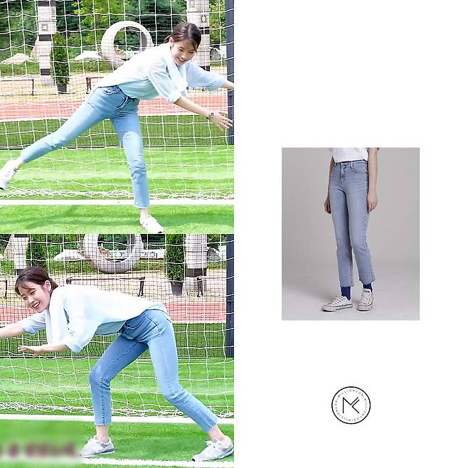 아이유가 착용한 제품은 '밀리언코르'의 커버밴드 캣브러쉬 슬림루즈 크롭 데님입니다.