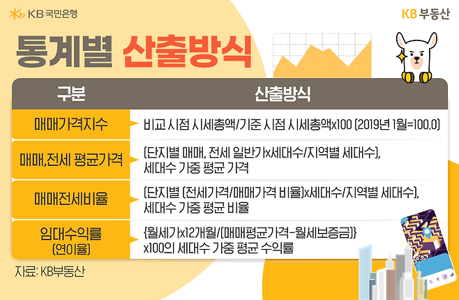 KB 오피스텔 통계는 매매가격지수, 매매평균가격, 전세평균가격, 매매전세비율, 임대수익률 등 5종의 통계로 구성됩니다.