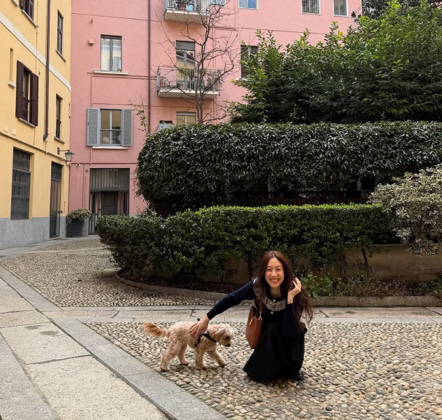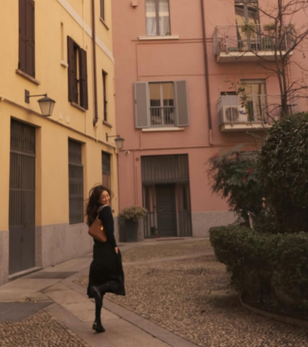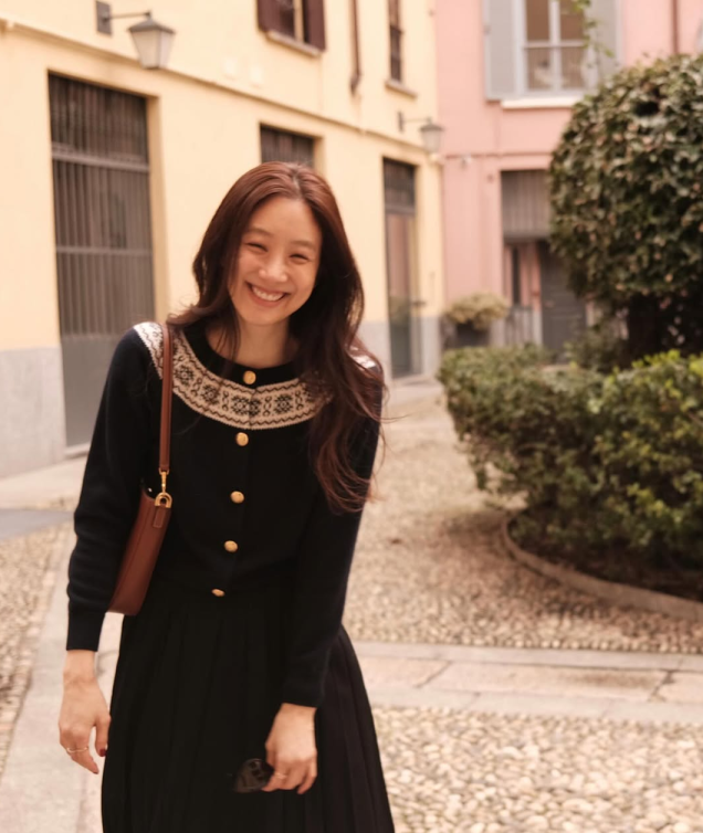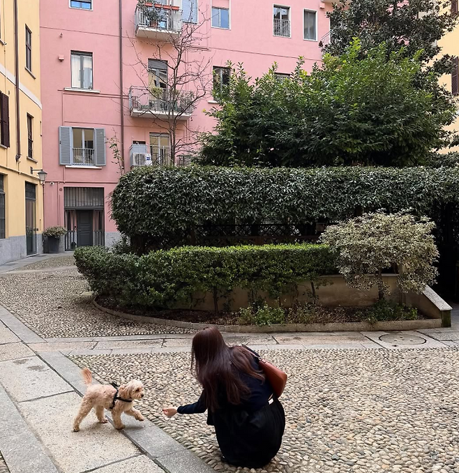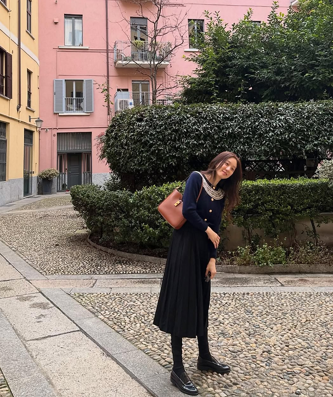 햇살이 스며든 돌바닥 위, 고풍스러운 핑크빛 건물과 초록 정원이 배경이 된 어느 오후, 정려원의 룩은 마치 한 편의 파리지앵 무드 영화 같았어. 블랙 롱 원피스에 섬세한 자수 칼라