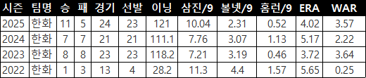 2025시즌 데뷔 첫 11승을 거두며 한화의 '미래'에서 '현재'로 거듭났던 그였기에, 최고 160km/h를 뿌리는 우완 정통파의 이탈은 류지현호에 큰 타격이었다.