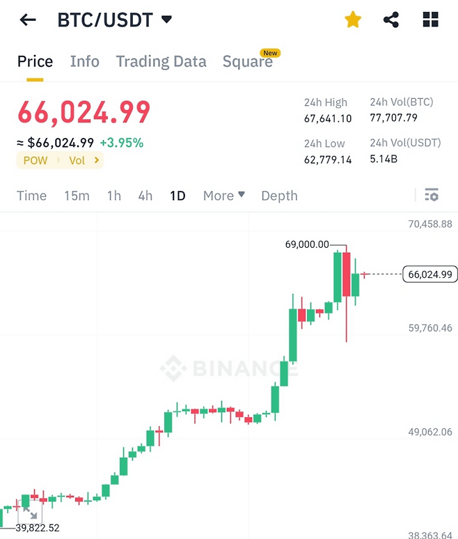 전날 역대 최고가인 6만9000달러를 달성한 뒤 14% 가량 급락했던 비트코인은 하루만에 하락폭의 대부분을 만회했다.