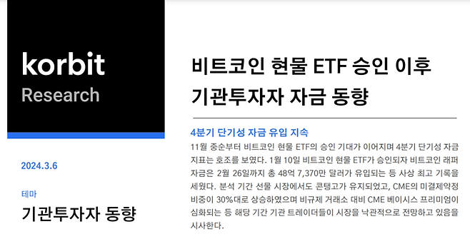 코빗은 “11월 둘째주 CME 미체결 계약은 11만 BTC를 돌파하며 1월 둘째주까지 전반적으로 상승세를 보였고, 사상 최고치인 11만6000 BTC를 기록했다”면서 “비트코인에 대한 기관투자자들의 관심이 큰폭으로 반등했다”고 말했다. 또한 선물가격이 현물가격보다 높은 ‘콘탱고’현상이 지속됐는데 이는 기관투자자들이 비트코인 가격에 대한 낙관적인 전망을 갖고 있음을 의미한다.